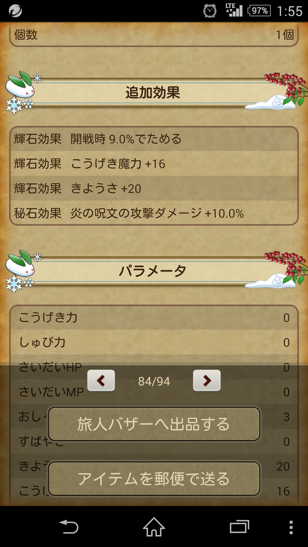 全員分合成したわけじゃないですが、カッツェのネックレスには攻魔5がつきました。ゼファーには並ばれました(笑)